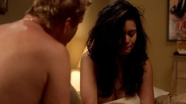Luego tenemos a Alyssa Diaz sentada en la cama junto a un chico. Las mantas le subieron hasta el pecho, pero sus pezones aparecieron a la vista mientras se movía un poco.