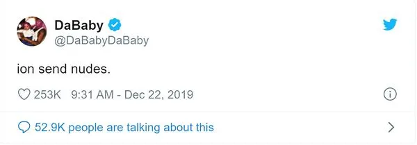 'Ion envía desnudos', publicó DaBaby en su Twitter una mañana después. Se supone que debe creerse en sus palabras, pero quién sabe muchachos. Tal vez esté mintiendo como una mierda.