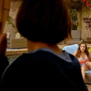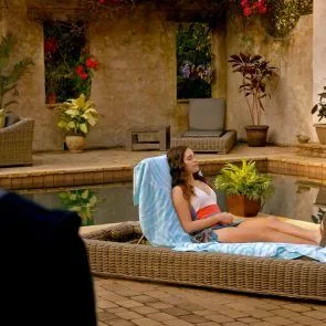 ¡Bien amigos, entonces la segunda escena de la misma serie de televisión está aquí! Mary Mouser tomando el sol boca abajo junto a la piscina mientras se levanta lentamente y descubre su escote en la parte superior de un bikini, luego camina en la distancia, y luego el primer plano como un hombre la mira.