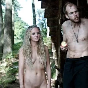 Hay una escena más completamente desnuda de la serie 'Vikings', ¡una de las series más populares de la historia! Aquí se vio a Maude Hirst desnuda, mostrando su coñito peludo y sus pequeñas tetas mientras su marido está aquí. ¡Necesitas ver lo jugosos que son sus labios vaginales y su cabello rubio!